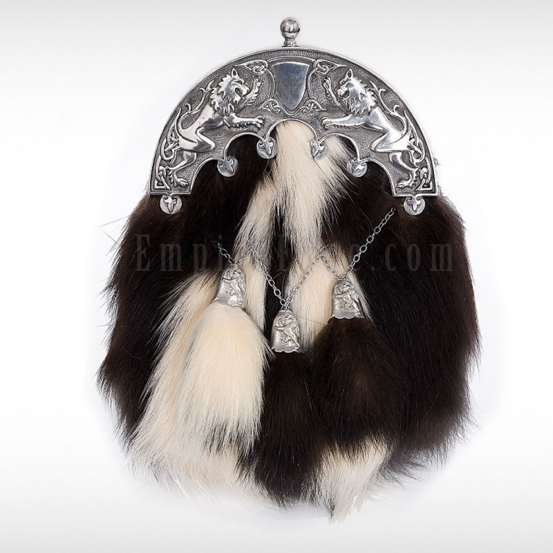 - Skunk skin dress sporran with a detailed pewter cantle of two rampant lions